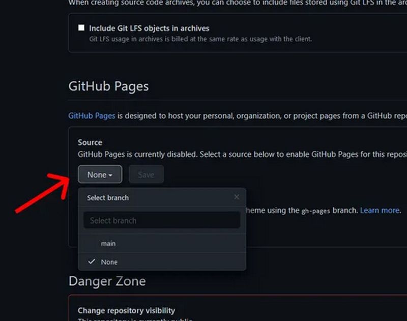 - Scroll to Github Pages and change the source from none to main branch then click on the Save button.