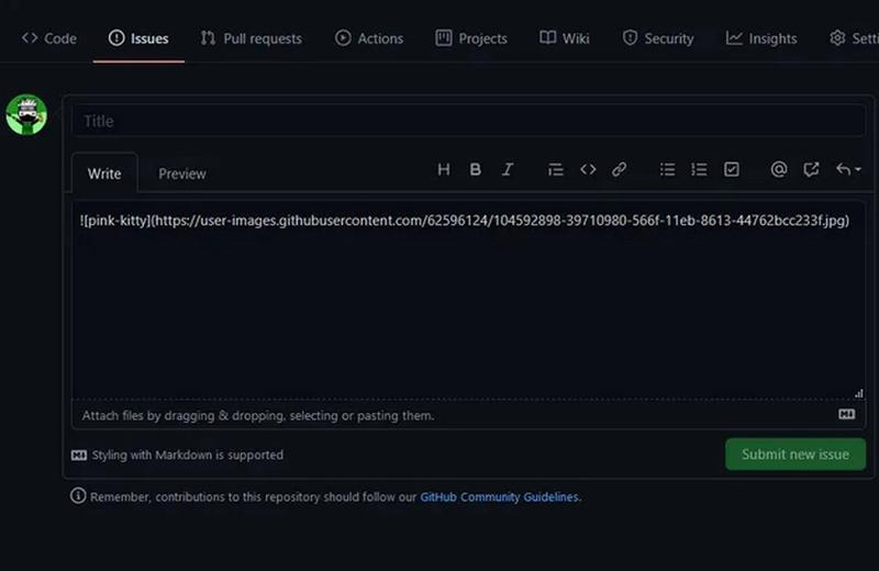 - Instead of writing an issue report, drag an image to the issue box. Github will save the image as a png file and show a link in markdown format like this: